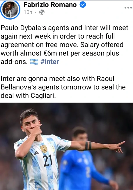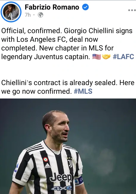 Giorgio Chiellini has signed a short-term contract with Los Angeles FC after passing medical tests hence will be a new MLS player next season. Paulo Dybala agents & Inter Milan representatives are set to meet this week inorder to reach full agreement on a free move that will see him earn around €6 Million per season plus add-ons.