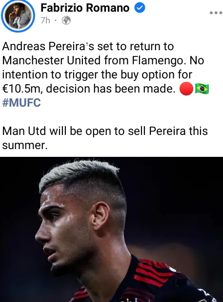 Manchester United are open to selling Andreas Pereira who is set to return to Old Trafford from Flamengo loan spell after they failed to trigger his €11 Million buy option.