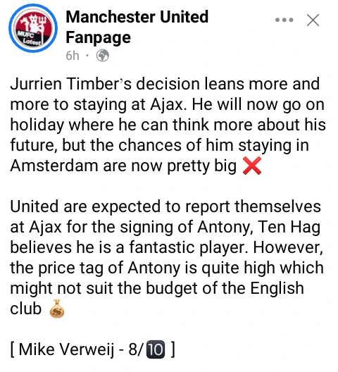 Manchester United are expected to contact Ajax officially for the signing of Antony and negotiate his high price tag as Erik Ten Hag believes is a fantastic player. Jurrien Timber decision leans more on staying at Ajax due to concerns over gametime at Man United and set to leave for his holiday and decide his future amid Man United links.
