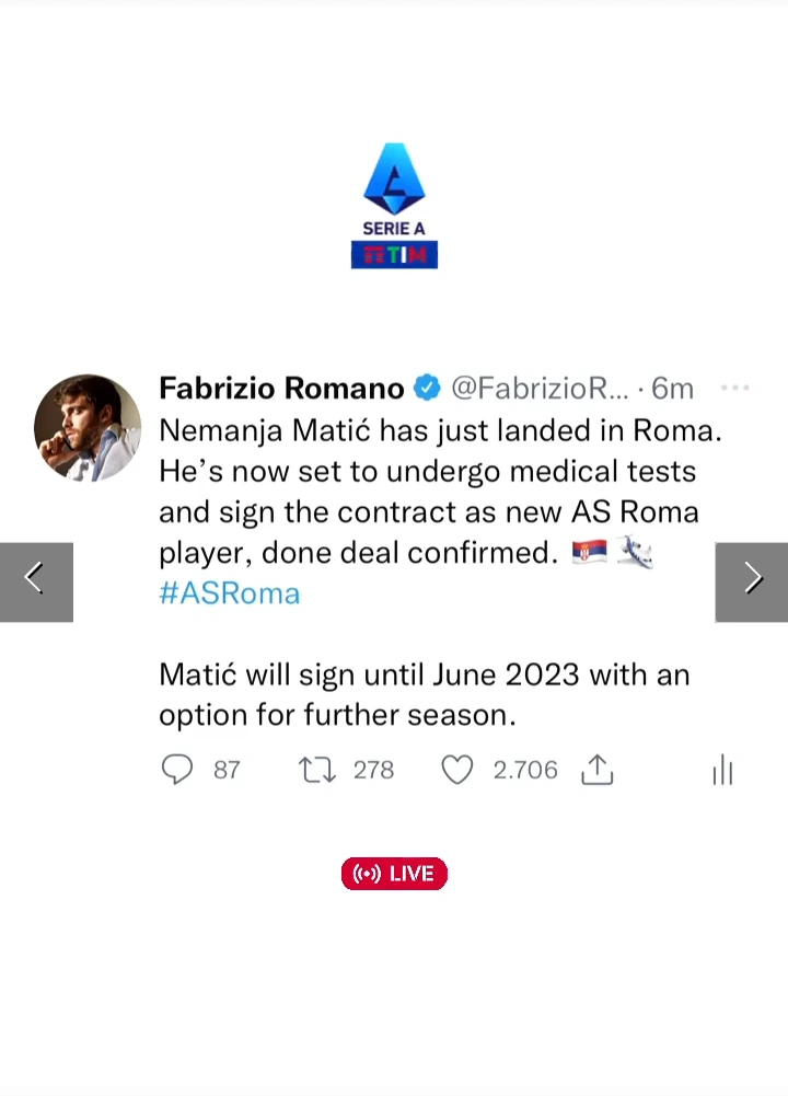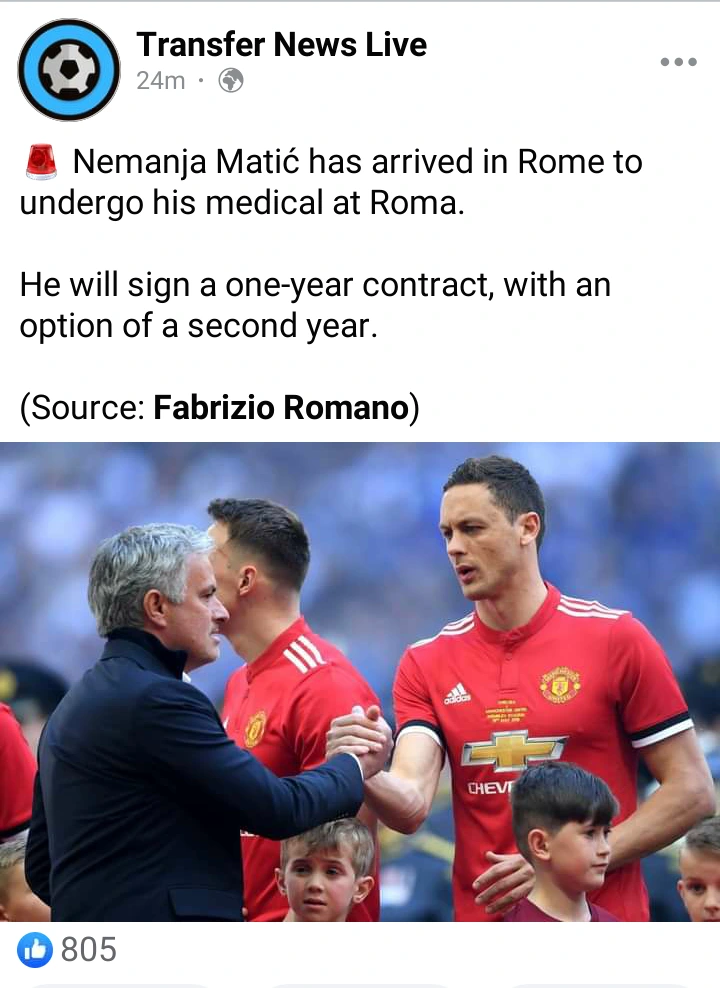 According to Fabrizio Romano; Nemanja Matic has just landed in Roma. He is now set to undergo medical tests.